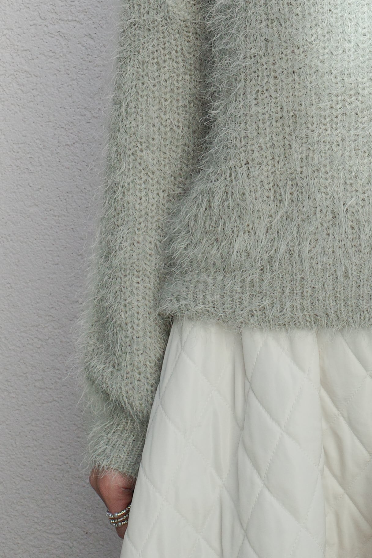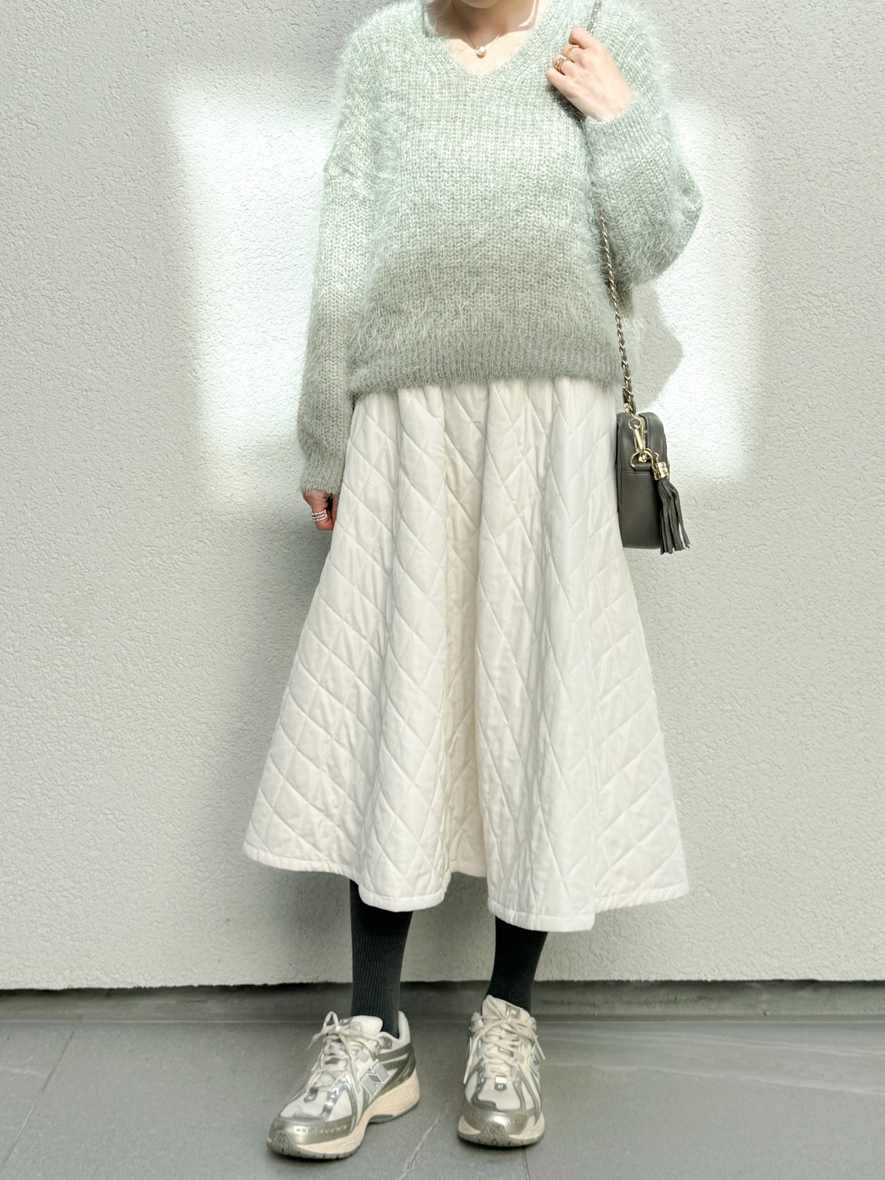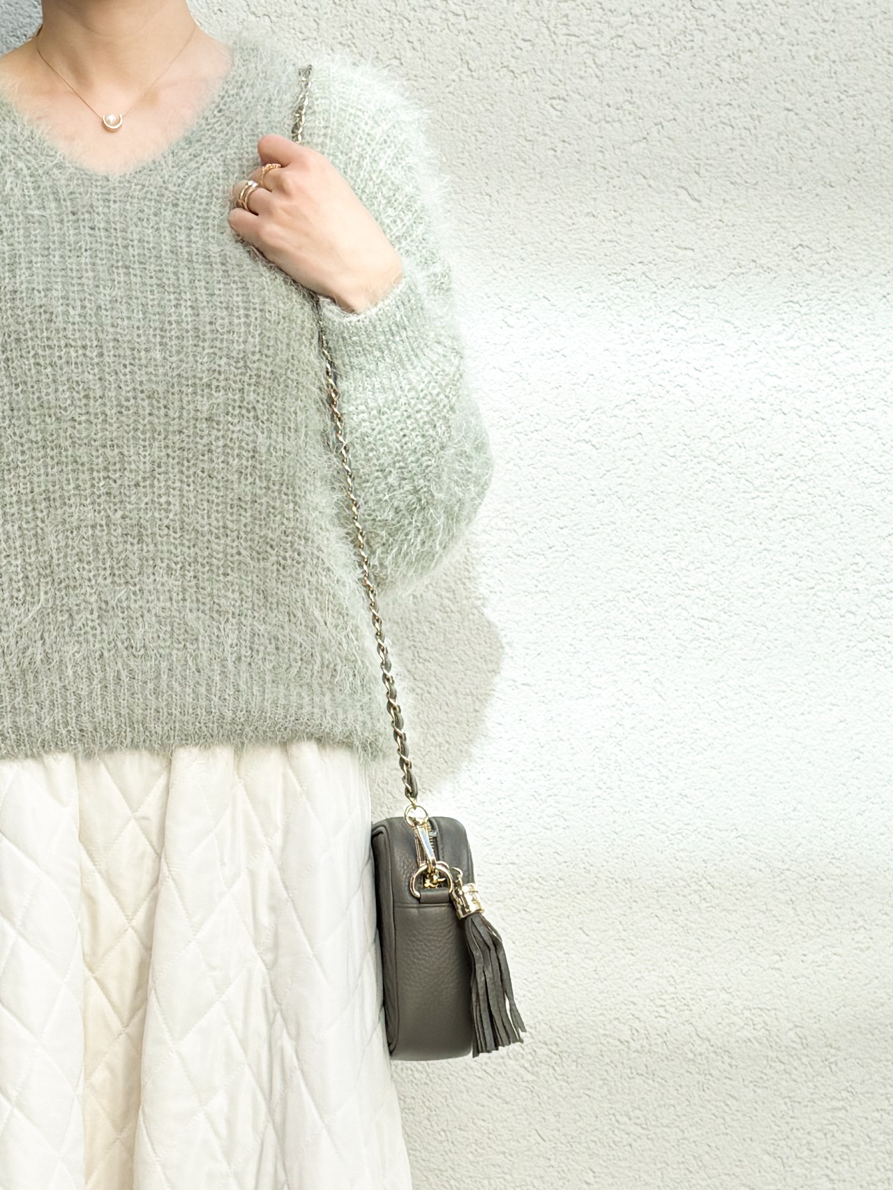 柔らかなグリーンカラーがコーデにやさしいニュアンスをプラス
