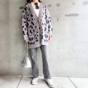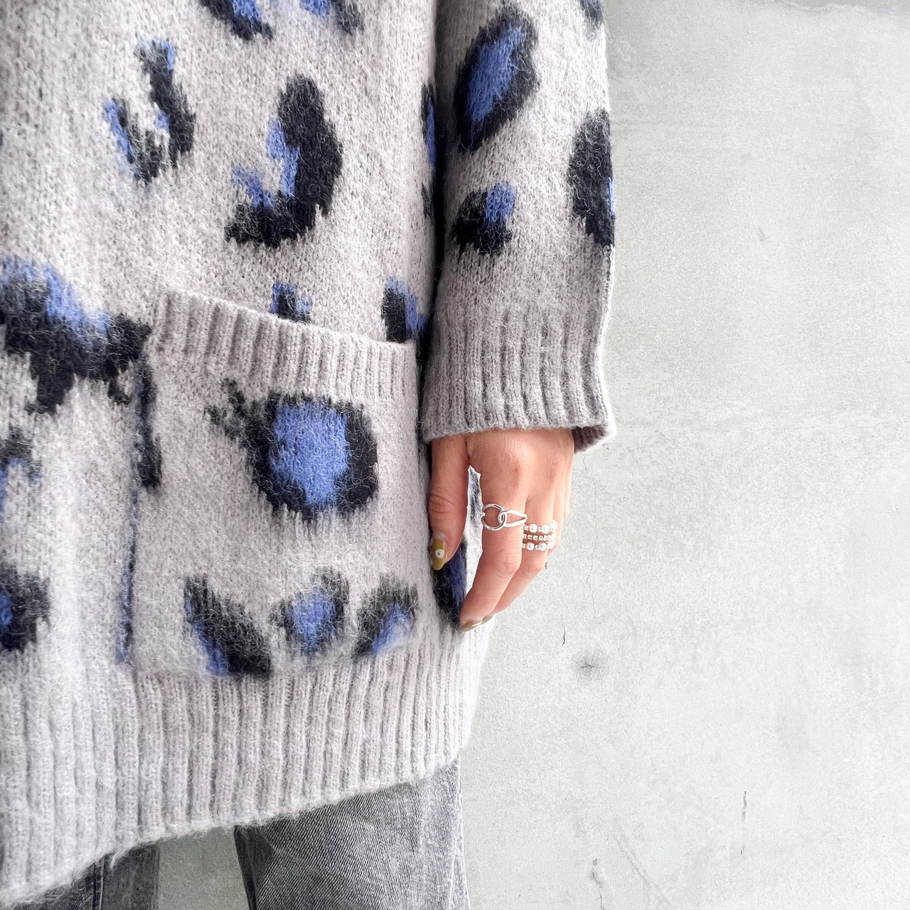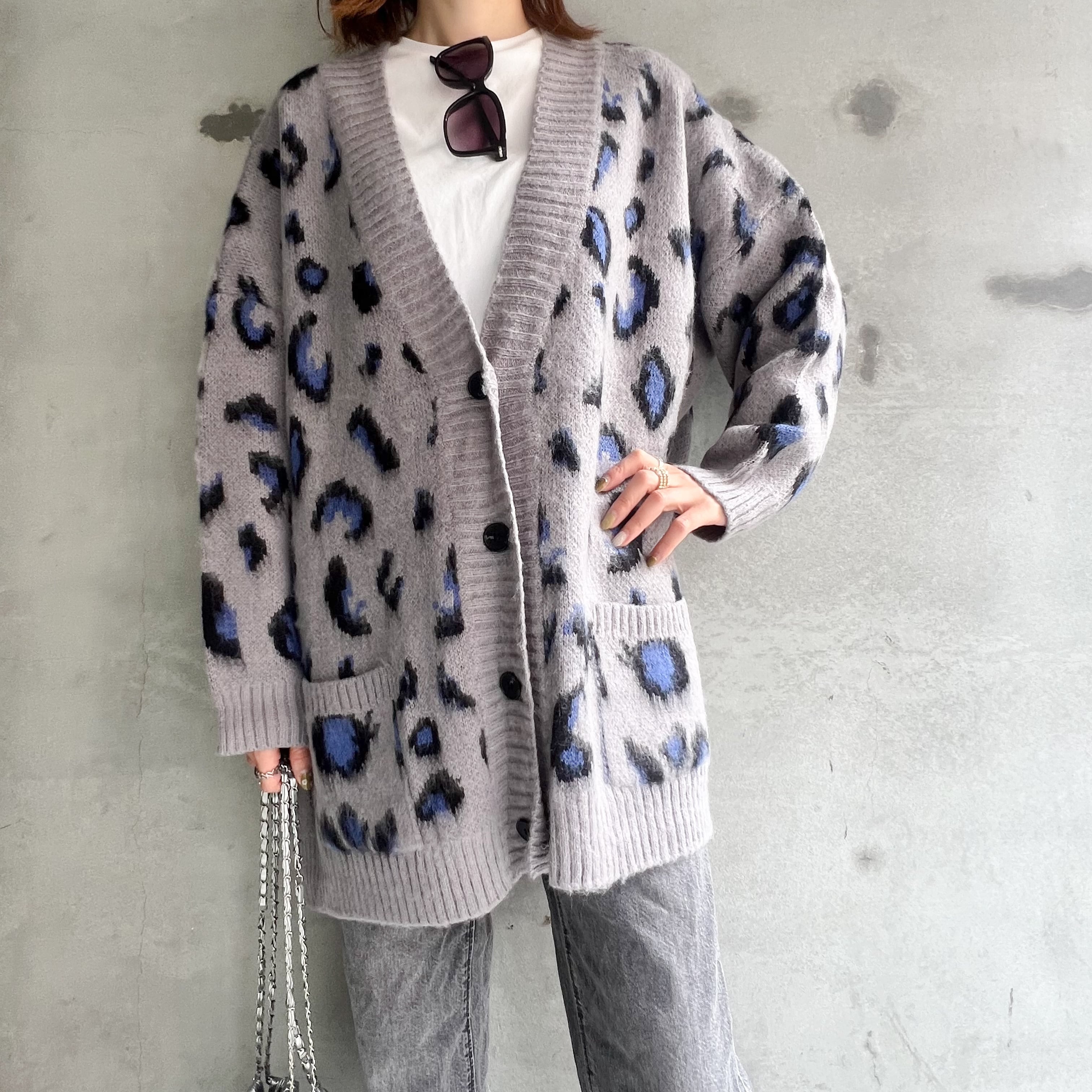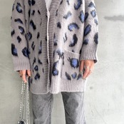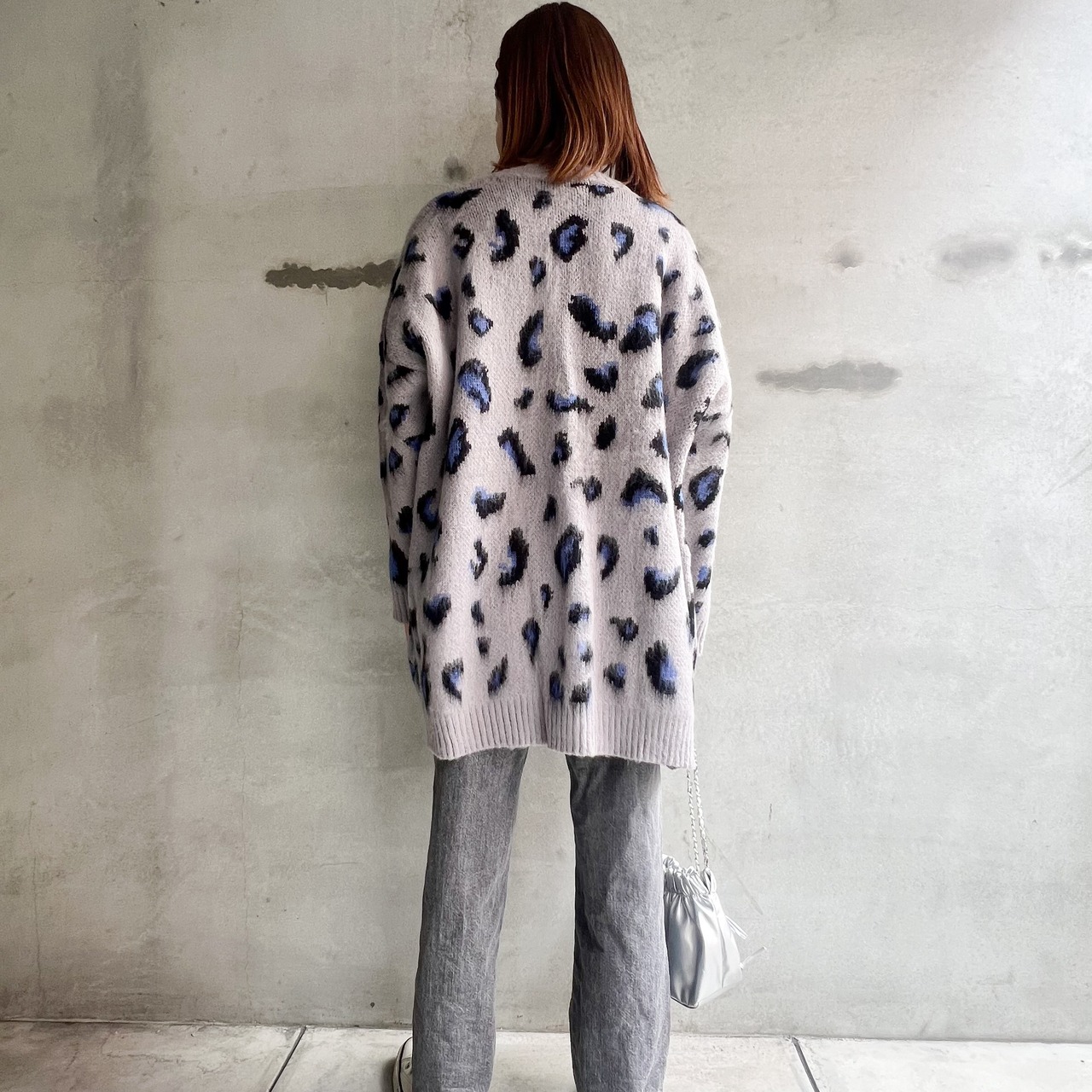 ブルーのヒョウ柄で、スタイリッシュに決まるオーバーサイズのロングニットカーディガンです。暖かい素材感が、コートの代わりにぴったりで、少し肌寒い日のおしゃれコーデに大活躍します!シンプルなコーディネートに合わせるだけで、トレンド感をアップさせることができるのが魅力です♡