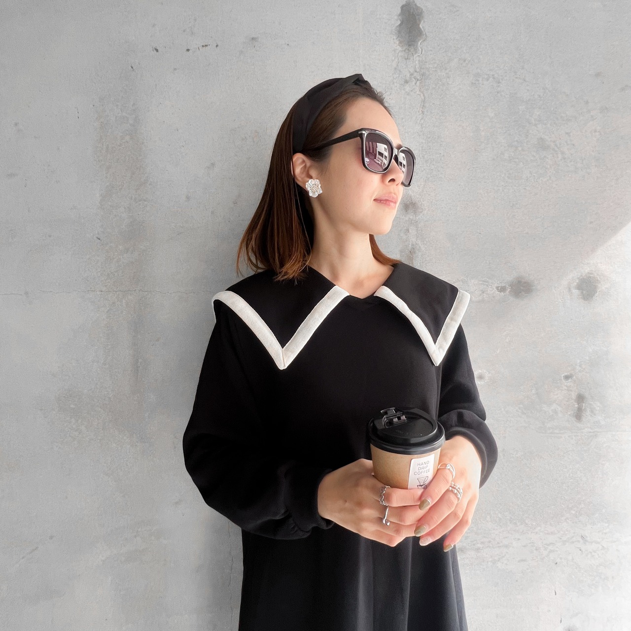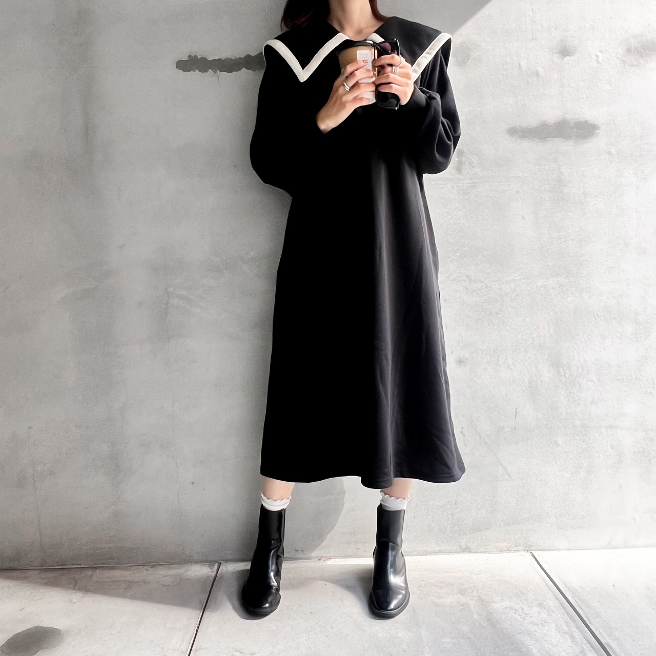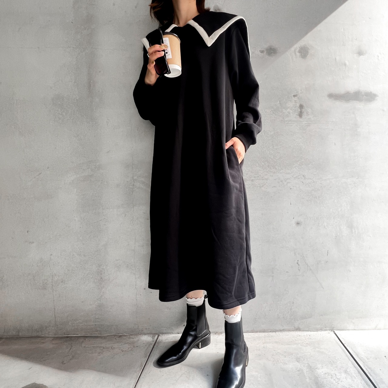 冬のコーディネートにぴったりな、裏起毛のワンピースです。パイピングのビッグカラーが特徴で、シンプルながらも存在感のあるデザインが魅力。膝下丈で、ブーツとの相性も抜群なので、スタイリッシュにおしゃれを楽しめます!暖かい裏起毛素材で、寒い日のお出かけにもぴったり♡