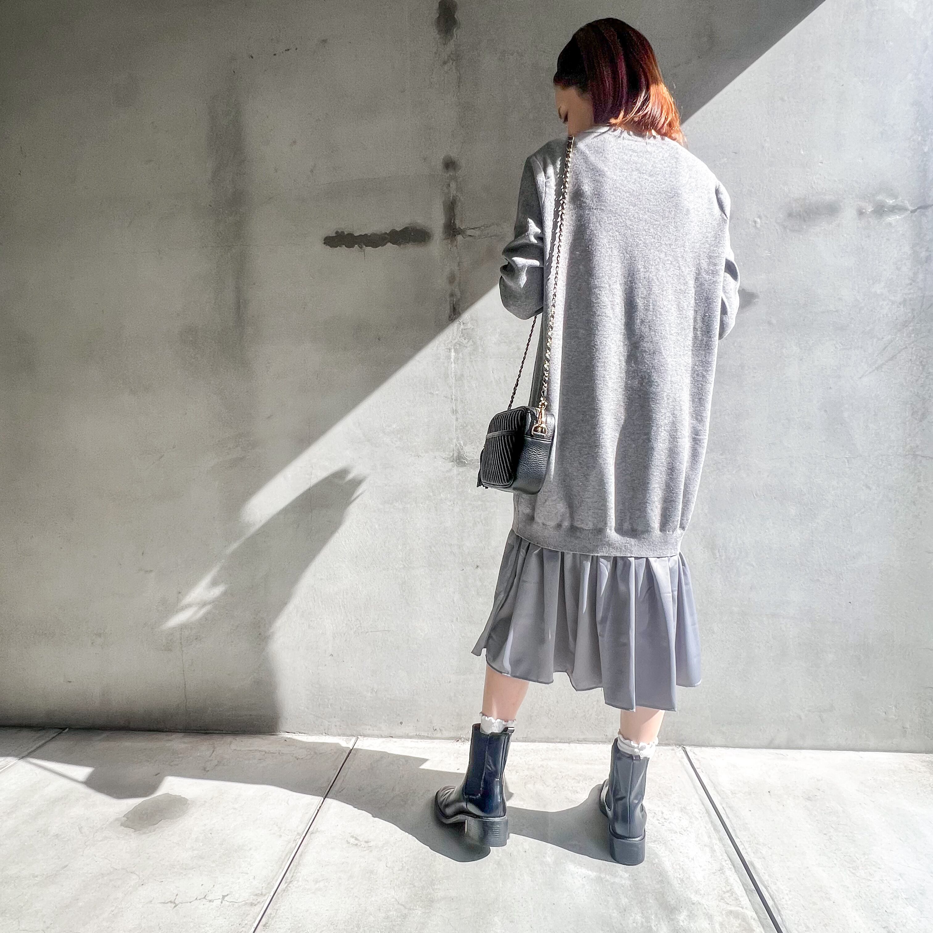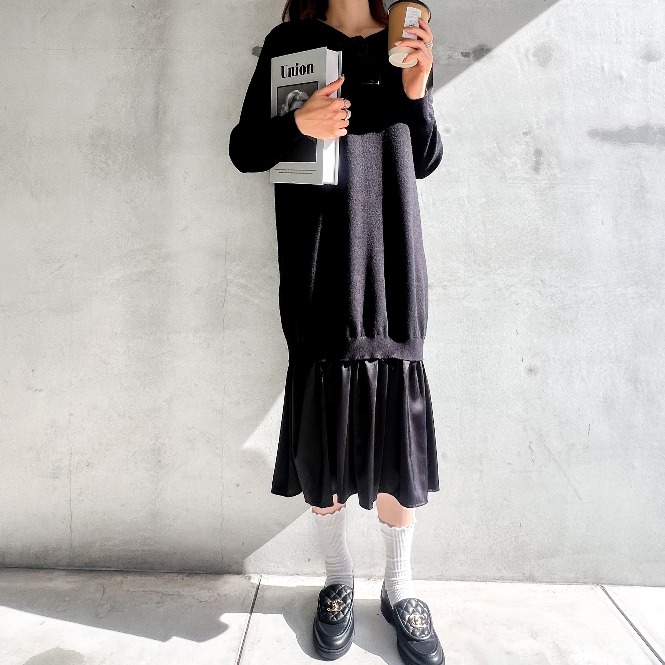 2種類の素材を使った裾プリーツワンピース。シンプルながらも個性的なデザインが特徴です。切り替えしのスタイルが身体のラインを優しく包み込み、どんな体型の方にもフィットする魅力があります!シアーのハイネックやつけ襟とも相性がよく、オリジナルのおしゃれを楽しめるのもポイント♡