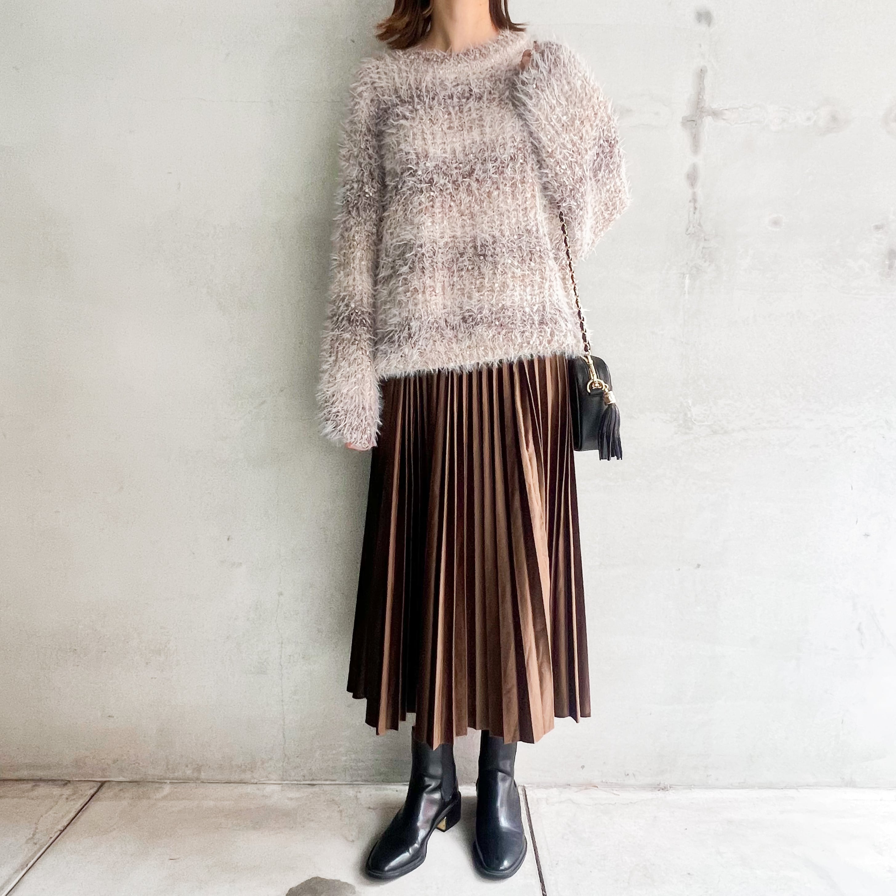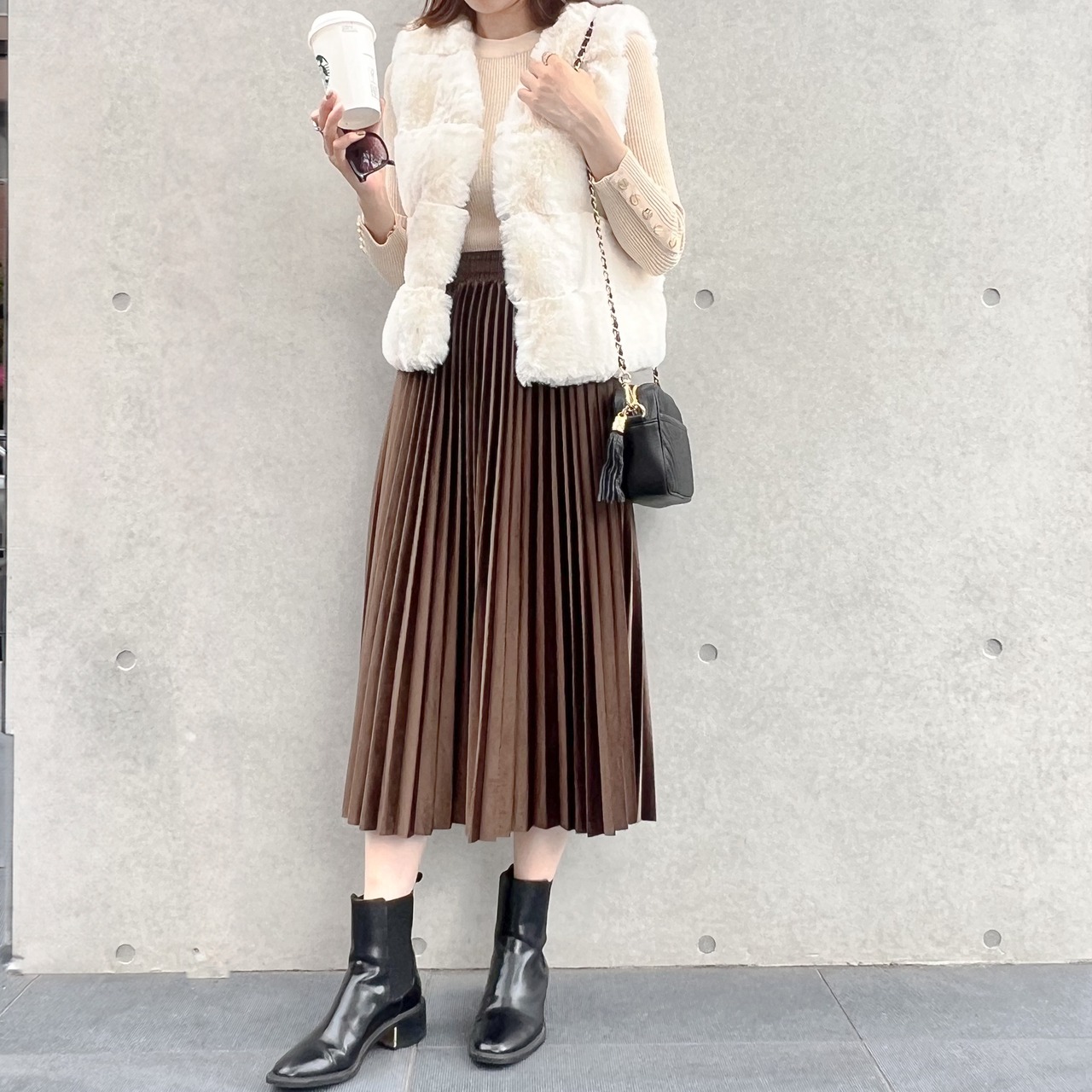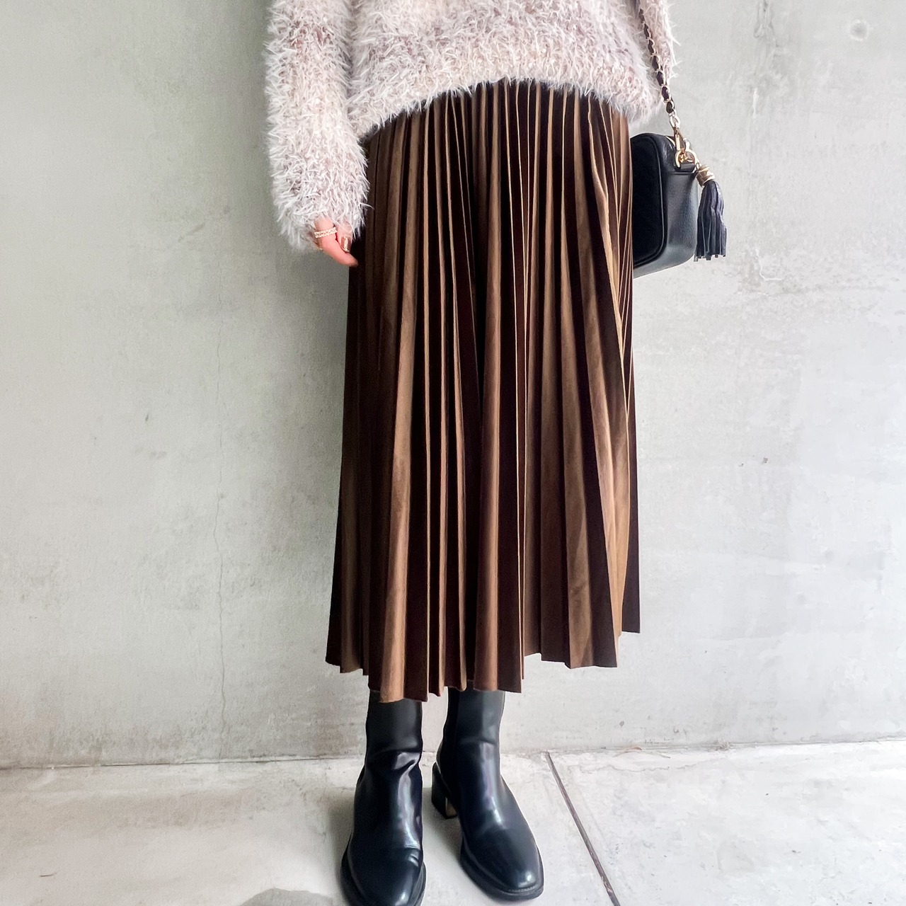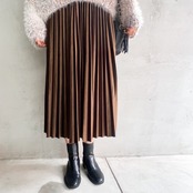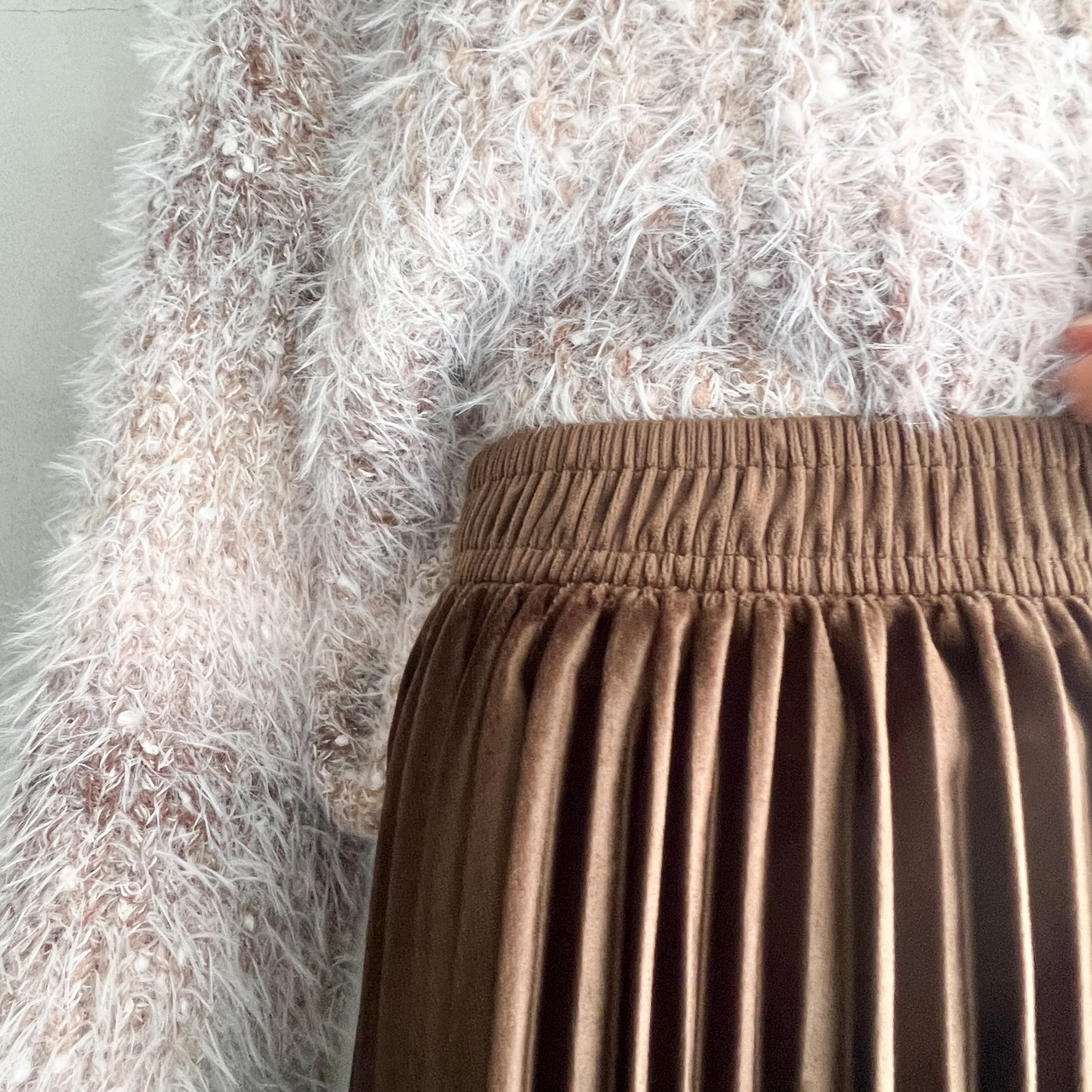 この冬履きたい暖かさのあるベロアプリーツスカート。ゴールドっぽい茶色が美しく、秋冬のコーディネートにぴったりの一枚です!プリーツデザインが動くたびに揺れるシルエットが女性らしさを引き立てます♡