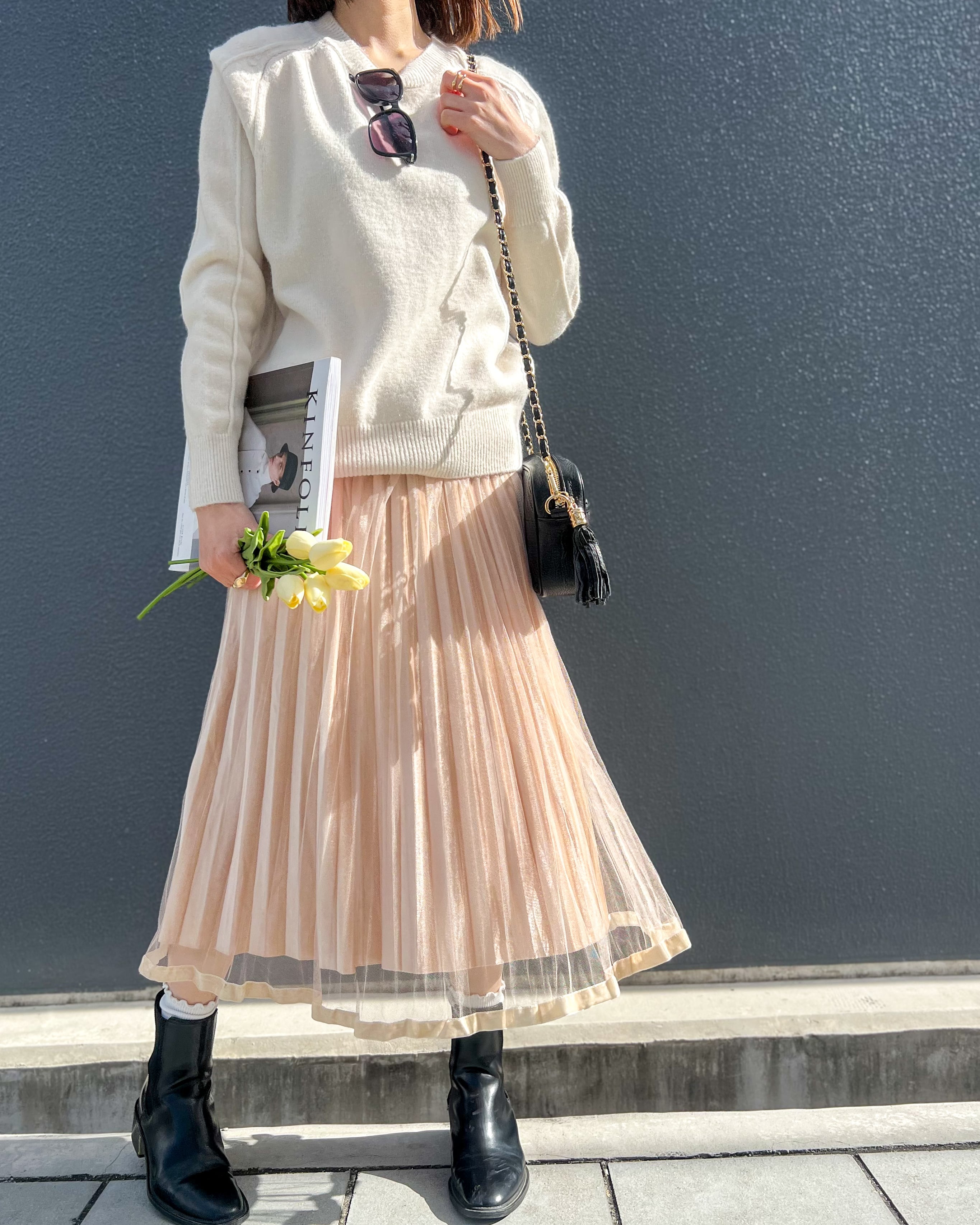 華やかなラメが散りばめられたデザインは、春の陽気に映えること間違いなし。爽やかな印象を与えつつ、シンプルさを兼ね備えた一着です!